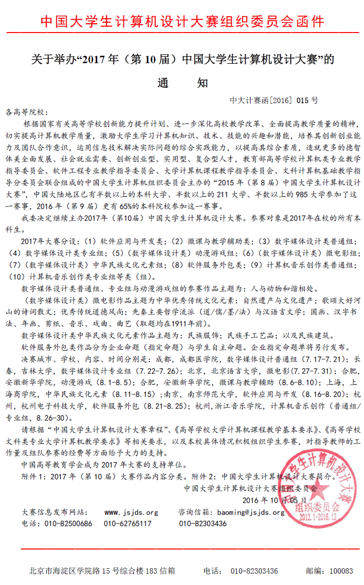 2017中国老员工计算机设计大赛通知 2017-03-14 11:52:00 浏览次数: 附1:2017年大赛通知及附件 附2:2017年软件服务外包企业命题 附3:2017年大赛奖项设置 附4:中国老员工计算机设计大赛简介 附5:2017年赛事安排 上一篇文章:关于开展2017年校级培育并推荐省级实验教学示范中心和仿真实验教学中心建设工作的通知 下一篇文章:关于开展2017年校级培育并推荐省级实验教学示范中心和仿真实验教学中心建设工作的通知