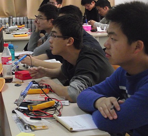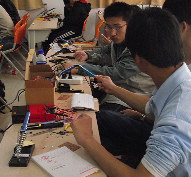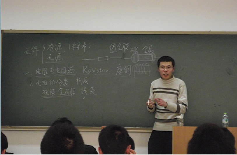 培训形式很简单。早上同学们应用基本工具做了基本的焊接,实际体验了一下如何焊接电路。下午,学长们给大家讲了一些科普知识,主要介绍了两方面的知识:一是关于电路板基本元件的知识,如电阻,二极管,三极管等;二是基本电路材料的摆放,如何防止磁干扰度。