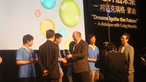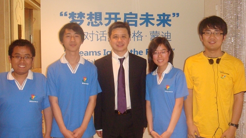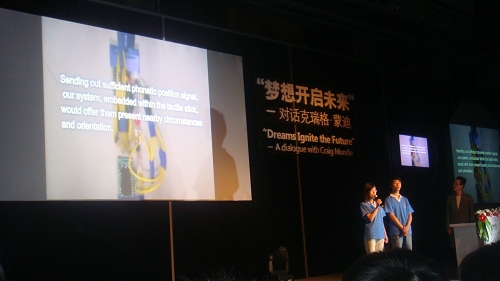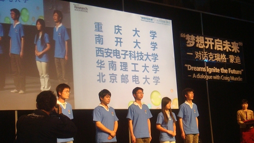 大会懿同首先由微软亚洲研究院副经理宋罗兰介绍高校微软技术俱乐部,随后的员工项目展示环节,西电微软技术俱乐部向大家展示了“智能GPS导航语音盲杖”项目,引起了在座微软研究员和包括清华北大在内的高校员工的广泛关注。随后蒙迪亲自为项目组陆懿同学颁发了2009微软精英大挑战全国二等奖的奖杯。在蒙迪的演讲结束后的一个小时问答环节里,西电微软技术俱乐部朱锐同学又抓住了宝贵的提问机会,现场对话盖茨接班人蒙迪先生。