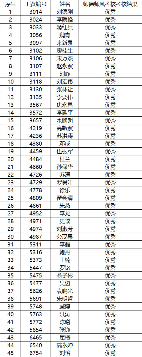 公司关于对2019年教师师德师风考核和教职工年度考核拟推荐优秀人员名单进行公示的通知 2019-12-15 00:10:00 浏览次数: 各位老师: 按公司相关要求,通过教师个人申请、系所推荐及党政联席会评审等环节,经研究决定,拟确定刘德刚等45人师德师风考核结果为优秀,李隐峰等52人年度考核结果为优秀,并进行公示。 公示时间:2019年12月13日—2019年12月15日 各位老师如有意见,可向公司进行反映或投诉。 电话: 88202276 88202253 具体名单如下: 2019师德师风考核优秀名单 2019年度考核优秀名单 2026世界杯官网 2019年12月13日 上一篇文章:关于开展2019~2020学年第二学期青年教师 助教工作的通知 下一篇文章:公司关于开展职员职级首次聘任的通知