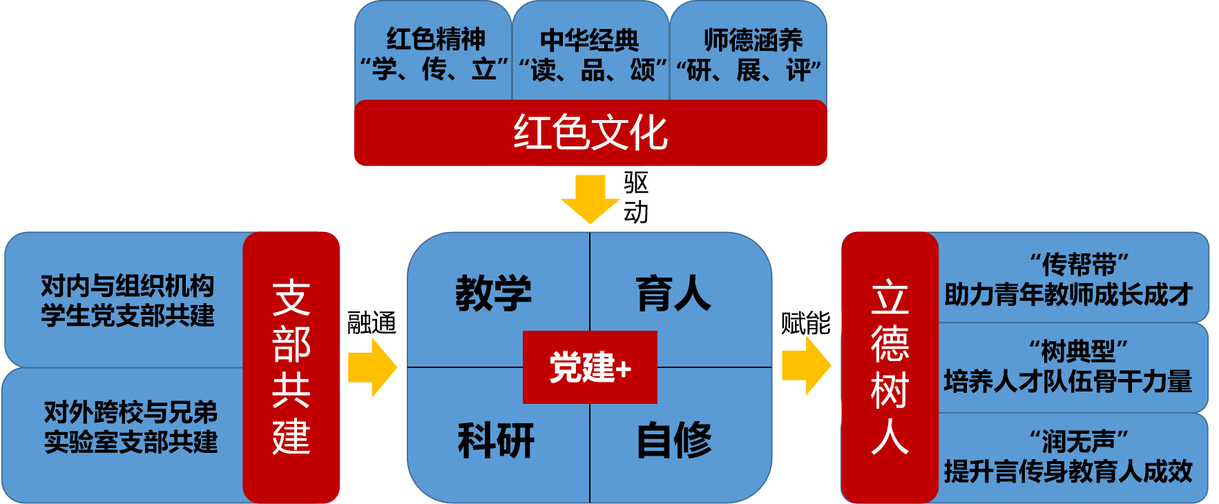 支部肩负立德树人重任,始终坚持党建与事业发展深度融合,以党建引领业务发展,聚力于“党建+育、教、研、修”模式,使业务融通支部建设,赋能新时代创新型人才培养,体现在: