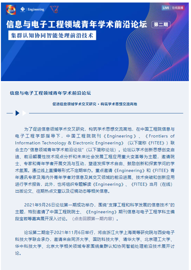 第二期预告|中国工程院院刊:信息与电子工程领域青年学术前沿论坛 2021-11-05 15:45:00 浏览次数: 责任编辑:邓鉴 上一篇文章:超高速电路设计与电磁兼容教育部重点实验室2021学术年会暨EDA研发中心揭牌仪式 下一篇文章:陈强院士专题报告会:温故知新:日本东北大学电磁工程研究室的历史与现状 ——从八木宇田讲起