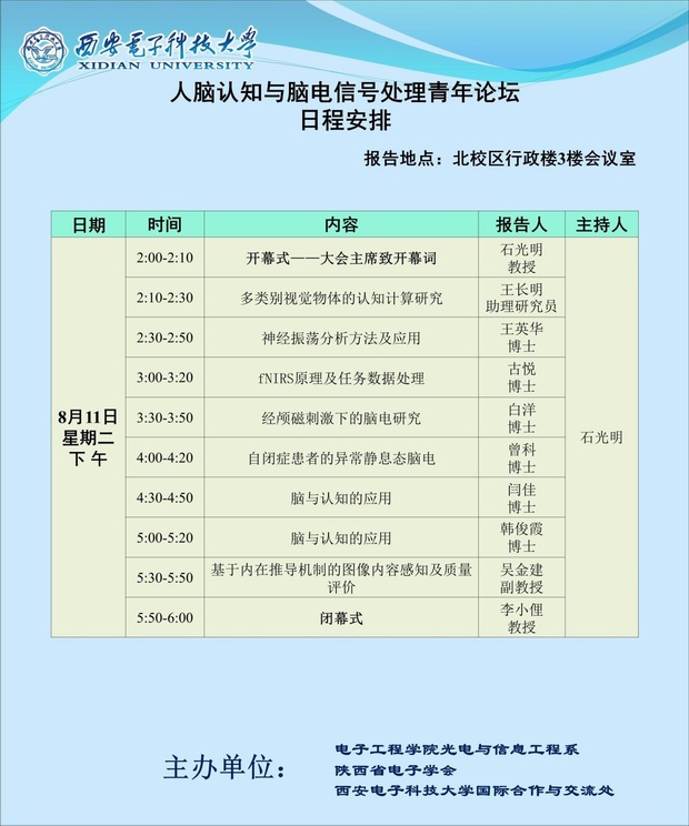 人脑认知与脑电信号处理青年论坛 2015-08-11 11:33:00 浏览次数: (通讯员:吴金建 王晓甜) 人脑认知与脑电信号处理青年研讨会将于2015年8月10-12日在西安举行,其主题为 “大脑的认知、探索与解读”。此次研讨会由2026世界杯官网光电与信息工程系主办,由西电“长江学者”特聘教授石光明教授主持。本次大会邀请了包括2026世界杯官网、北京师范大学、燕山大学、北京医科大等高校同行专家出席。 上一篇文章:人脑认知与脑电信号处理青年论坛成功举办 下一篇文章:南洋理工大学兼公司“海外名师”Lin Weisi教授应邀来访