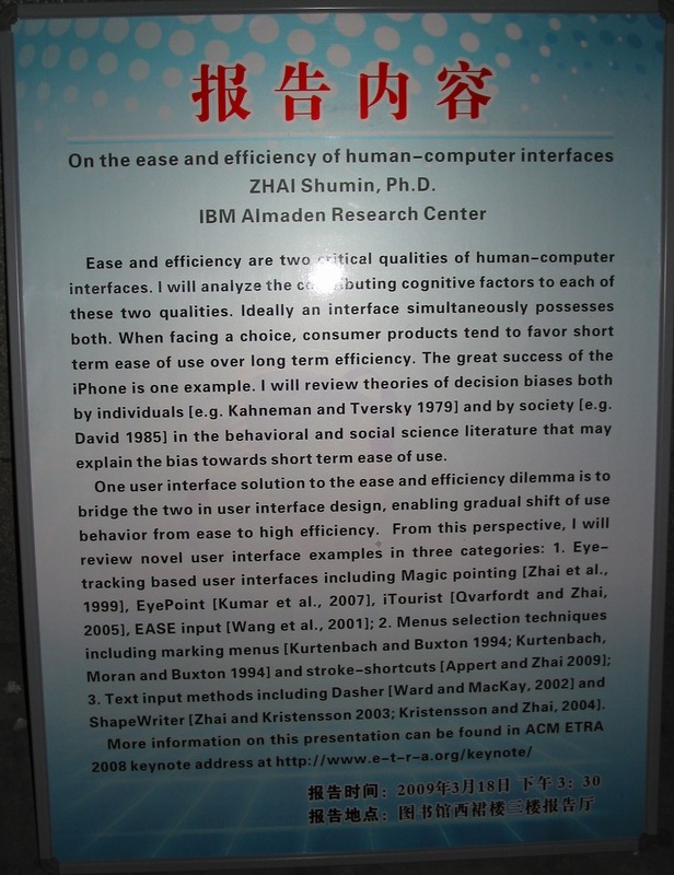 IBM研究中心翟树民博士报告会--人机界面的易用性和高效性 2009-03-17 22:03:00 浏览次数: 翟树民博士报告会--人机界面的易用性和高效性 报告地点:图书馆西裙楼三楼报告厅 报告时间:2009年3月18日下3:30 来源:西南门口布告栏 2026世界杯官网网络信息中心 拍摄 发布 上一篇文章:德国汉堡技术大学副董事长罗林教授受聘担任公司客座教授 下一篇文章:CISP’09-BMEI’09 天津,SCI/EI 检索